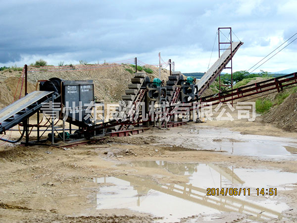 挖斗洗砂機(jī)工作時(shí),電機(jī)通過(guò)三角帶、減速機(jī)、齒輪減速后帶動(dòng)上料機(jī),均勻給料到滾篩進(jìn)行篩分,合格產(chǎn)品經(jīng)過(guò)溜槽進(jìn)入洗槽中,此時(shí)鏈斗裝置的動(dòng)力系統(tǒng)帶動(dòng)四角輪緩慢轉(zhuǎn)動(dòng),在鏈斗的帶動(dòng)下翻滾,并互相研磨,除去覆蓋砂石表面的雜質(zhì),同時(shí)破壞包覆砂粒的水汽層,以利于脫水;同時(shí)加水,形成強(qiáng)大水流,及時(shí)將雜質(zhì)及比重小的異物帶走,并從溢出口排出,完成清洗作用。干凈的砂石由挖斗提起,砂石從上四角輪倒入出料槽,完成砂石的清洗作用。