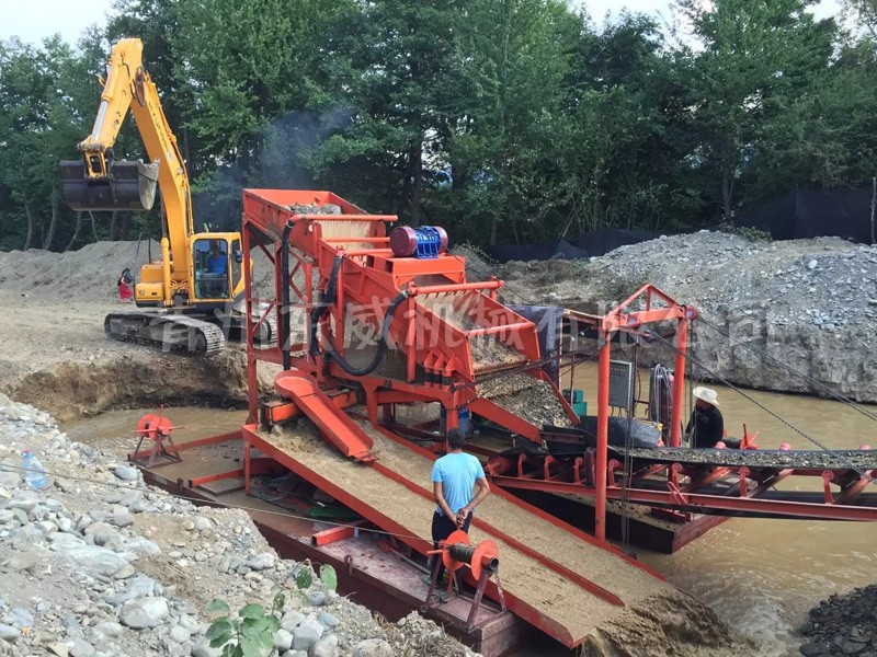 振動(dòng)式選金機(jī)是一個(gè)緊湊型、可移動(dòng)的整體結(jié)構(gòu)。頂部為篩條部分,可以將大塊物料隔除,同時(shí)物料落入二次篩分機(jī)構(gòu),充分篩分后,高壓力水將沙子沖入溜槽選金。該選金機(jī)結(jié)構(gòu)金緊湊、操作簡(jiǎn)單、低運(yùn)行成本。明顯比市場(chǎng)上其它選金設(shè)備有優(yōu)勢(shì),無需豐富的選金經(jīng)驗(yàn)即可操作。
