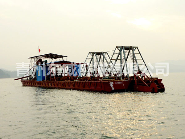 鏈斗式挖沙船可根據(jù)客戶性能要求及工礦作業(yè)特點(diǎn)設(shè)計制造。物料挖掘出來并由輸送機(jī)或輸送泵輸送至岸邊、運(yùn)沙船的功能;浮體采用橫骨架式分體箱形結(jié)構(gòu),轉(zhuǎn)運(yùn)時可拆裝后裝車。裝有定位設(shè)備、鏈斗挖掘裝置、橋架升降裝置及皮帶輸送機(jī)等。水下桿是由安裝在浮體上的絞車實現(xiàn)升降,砂石料通過鏈斗裝置挖掘上來,由輸送機(jī)或輸送泵輸送到岸上或運(yùn)沙船。