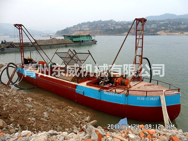 該抽沙設(shè)備主要適用于水庫、河道、湖泊等寬車輛不能進(jìn)入的闊水域作業(yè),工作流程為抽沙運(yùn)輸船開到抽沙區(qū)域,利用抽沙船自帶的抽砂系統(tǒng)將沙子抽進(jìn)船艙,抽滿船艙后運(yùn)輸至岸邊,打開底艙門,將沙子卸到水里,再用岸邊的小型抽沙機(jī)抽出并輸送至碼頭或者直接用抽砂泵講沙子從船艙輸送至碼頭。該設(shè)備結(jié)構(gòu)簡(jiǎn)單、工作量大、易損件少,抽出來的沙子含泥量低,無石塊,沙子質(zhì)量好,是近幾年采沙、清淤比較常用的工具。